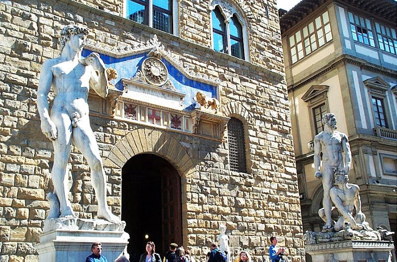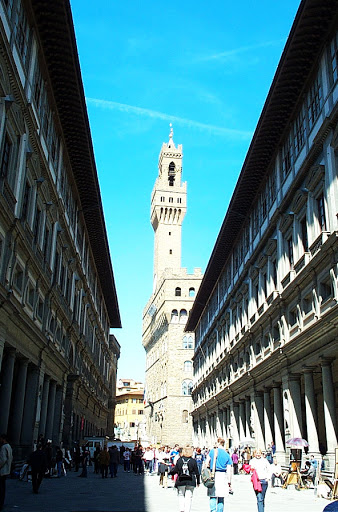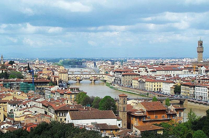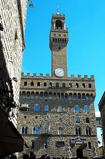 天主聖三橋 興建於文藝復興時期,長32公尺。該橋由佛羅倫斯建築師Bartolomeo Ammanati興建於1567年至1569年。 1608年,橋上增建了四季雕塑,以慶祝科西莫二世·德·美第奇與瑪利亞·馬格達萊納的婚禮:《春》(Pietro Francavilla),《夏》和《秋》(Giovanni Caccini),《冬》(Taddeo Landini)。 舊橋 同樣位於阿諾河上,建於1345年,是歐洲出現最早的大跨度圓弧拱橋。 舊橋的另一個特別之處在於橋上建有店舖,最初為肉鋪(註:為什麼時肉鋪咧...據說是殺豬殺雞之後, 那些外國人不吃的內臟..等就直接"下水"...嗯, 果然...中國人稱那些為下水也是有道理的...呵呵...),現在則多是首飾店和旅遊紀念品店。 舊宮 (Palazzo Vecchio)也是目前佛羅倫斯的市政廳。Vecchio 這個字是古老的意思,不過也有人直譯為『維奇歐宮』。 厚重的羅馬式建築,開垛口的堡壘,使其成為托斯卡尼最宏偉的市政廳。 它俯瞰著領主廣場,門口置放米開朗基羅大衛像的複製品,以及眾多的雕塑傑作。 領主廣場 (Piazza della Signoria) 領主廣場是佛羅倫斯的中心廣場,呈「L」形,市政廳舊宮及其鋸齒形塔樓是廣場上的主要建築,至今仍是該市政治和社會生活的中心。 廣場上羅列著眾多的雕塑傑作,例如大衛像的複製品、科西莫一世青銅騎馬像、海神噴泉、海格力斯和凱克斯等等,如同一座壯麗的露天博物館。 聖母百花大教堂 (義大利語:Basilica di Santa Maria del Fiore)