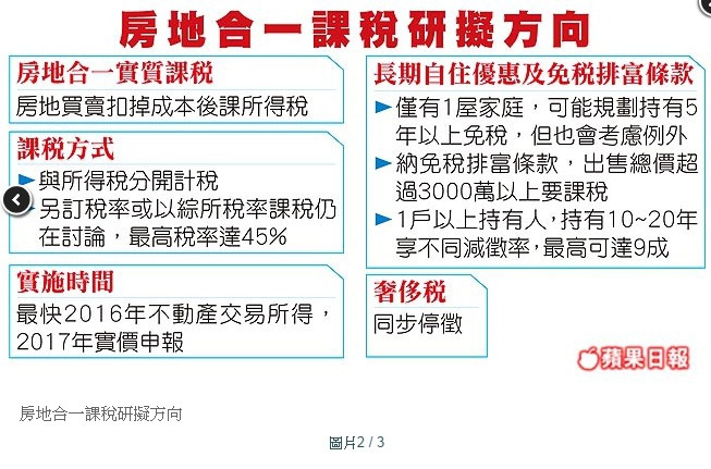 談及課稅原則,財政部官員表示,為了防止假自住真逃稅,將採嚴格限制,一戶自用住宅者須持有房屋五年以上才享免稅優惠,且設有「排富條款」,如果出售房屋總價超過三千萬以上的豪宅不適用。財政部官員透露,如果擁有一戶以上的屋主長期持有房產達十年、甚至二十年,將享有減徵優惠,最高可達九成。官員說,最快後年實施房地合一稅新法,也就是說,民眾在二○一七年五月將申報前一年(二○一六)的售屋所得。由於房地合一稅房屋持有年限較現行的奢侈稅兩年更長,官員說,屆時奢侈稅也將同步停徵。