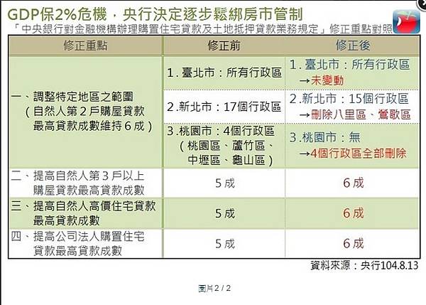 央行首度宣布鬆綁房市管制措施。央行今日下午召開臨時記者會宣布,調整特定地區的範圍,新北市八里與鶯歌,以及桃園市桃園區,蘆竹區,中壢區與龜山區等四個行政區自特定地區裡刪除,另外,同一人名下第三戶以上房貸成數,以及豪宅貸款最高貸款成數,與公司法人購置住宅貸款成數,均由先前的五成提高至六成。